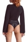 Elegancja, szyk i energia. Unikalne wizerunkowo body z długimi, otwartymi ramionami i intrygująco głębokim dekoltem. Zostało wykonane z 2-u różnych materiałów. Góra z miękkiej, szlachetnej i bardzo przyjemnej w dotyku czarnej dzianiny. Pięknie się układa na ciele i jest bardzo przyjemna w dotyku. Dół wykonany z czarnego, elastycznego wetlooka. Z tyłu wykorzystano pionowe przeszycie lekko marszczące materiał.